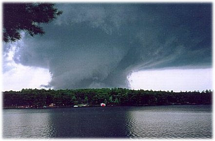 According to Murray, the tornado began as three small twisters that merged into one big one right before his eyes. Sunday afternoon, July 28th, around four O'clock. Hot and muggy with shifty air and edgy skies. He and Mike grabbed his wife, Ann-Marie, a polio survivor who can't walk very well let alone run, and carried her to the basement of the marina house as the legendary freight train sound smothered in around them. It passed 100 yards North of the marina, leaped into the lake crossing between Oak Island and our place, Rebel’s Isle, made a turn and slammed the far shore hurling trees onto cottages, snapping huge moonraker pines right in half and dropping the top halves several yards from their broken spikes. According to Peter who watched it come right at them from across the lake, it was fully formed over Stoney Lake, black with debris whirling hundreds of feet in the air before it arrived at Kasshabog's shore, spawned another twister, perhaps two, and then reformed as it crossed the water's edge. It disappeared momentarily and then re-emerged as a water spout seventy five feet at it's base and hundreds of feet tall. He watched and took photos as it passed directly between Rebel and Oak heading straight at him. The rest of the family were down in the most sheltered place they could find. Peter, an ocean sailor who has weathered hurricanes and a tornado at sea remained up top, enthralled. Finally his nerve gave out, or he came to his senses and joined them as the twister hit just up the shore with that sound of the freight train going by at high speed. One little niece was seen, but not heard screaming. The other chewed the button on her shirt and kept her head down and her eyes closed. When it was gone it was quiet except for the sound of the storm surge as the lake sloshed from one side to the other like a shallow bowl of soup. The storm cut a swath through the forest to the waters edge 150 yards wide where we could see it from the road and from the water on both sides of the lake. As we left for home today we could see turkey vultures circling over something out of sight in the forest. As the luck of these things runs, it passed within two hundred yards of Rebel leaving only a fallen branch or two, and one pine bow caught like an arm in a hammer lock under the eaves. No damage. All told, it was a good weekend to have been somewhere else.