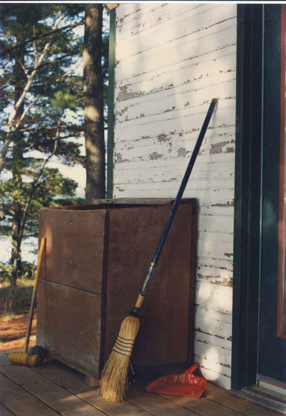 If there’s an icon for cottage life it should not be a pine tree against the sky or a loon, it should be a broom. Where there are walls there are spiders, and where there are spiders there are white sticky things that catch pine needles and grit and they need constant sweeping. There are decks. And paths. And floors. Show me a day that doesn’t involve a broom and I’ll show you some neglected chores. Sweeping is not a chore to avoid, but a pleasant meditative activity. You begin at one end of the deck and you dance with your broom, swaying rhythmically to your own inner beat as you advance in a line sweeping all before you. Gradually, you come to the edge of the deck and over the side it goes. While you sweep you can think, or not think, just hum a little tune in your head, tune in to the birdsong about you. Soon you are done. It’s pouring rain now. The thunder has stayed away but you can barely see the near shore. We are shrouded in a soft grey curtain of rain coming straight down. The temperature has dropped; rats, at least it was warm before.